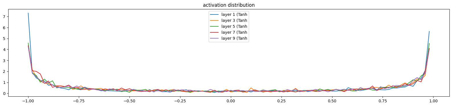 .weight *= 1.0 #5/3                     当不加batchnorm时,需要乘5/3相当于把w放大了一些,原因是tanh将输出缩小到-11,所以需要放大来抵消tanh的缩小作用。加了batchnorm后,就不需要*5/3了,乘以1保持原状即可。5/3被称为tanhgain,linearconv,sigmoidgain都是1, relugain是根号2