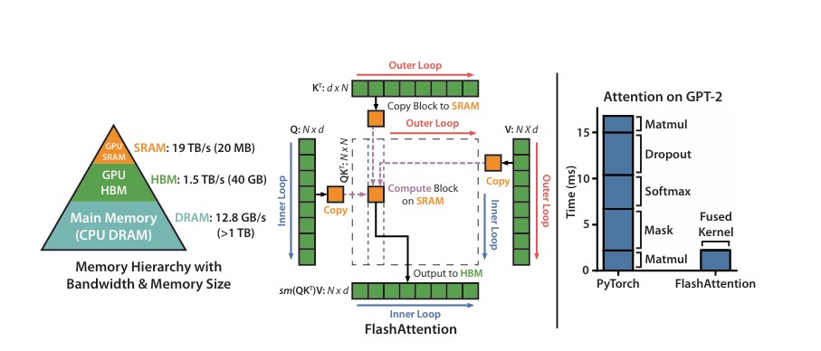 FlashAttention利用底层硬件的内存层次知识,例如GPU的内存层次结构,来提高计算速度和减少内存访问开销。 FlashAttention的核心原理是通过将输入分块并在每个块上执行注意力操作,从而减少对高带宽内存(HBM)的读写操作。具体而言,FlashAttention使用平铺和重计算等经典技术,将输入块从HBM加载到SRAM(快速缓存),在SRAM上执行注意力操作,并将结果更新回HBM。FlashAttention减少了内存读写量,从而实现了2-4倍的时钟时间加速。