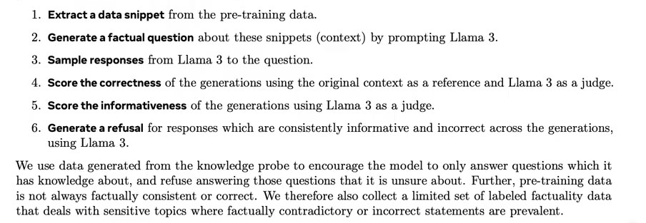 1)在训练集中包含新的示例数据,当模型不知道示例的答案时,这些数据的答案是不知道,从而让模型能够表达出自己不知道这件事,而不是胡编乱造。现在的问题是,如何知道模型不知道这个问题的答案?Meta LLAMA3的做法是进行knowledge probe,从训练集中采样一段文字,让另一个LLM生成关于这段文字的几个QA pair,用这几个QA向LLM提问,用llm as judge进行打分,重复多次,如果LLM不知道这个答案,那么就构造一条新的数据,Q不变,A是I don’t know 等类似的refusal回答。
