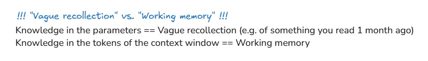 神经网络的参数是一种模糊的回忆,而上下文窗口是模型的工作记忆,和人类类似。上下文的数据可以被模型直接访问,它直接输入到神经网络中,而不是模糊的记忆。这对我们使用LLM也有帮助,例如,问LLM, can you summarize chapter1 of Pride and Prejudice? LLM可以很好地回答,因为LLM看过傲慢与偏见,LLM有足够的记忆。但是比起让LLM回忆,更有效的方式是直接提供给他们信息,将第一章的内容也输入到上下文窗口中,这样LLM可以直接访问他们,而不需要回忆。LLM回答的质量也会显著提高。(这和人类一样,在总结之间重新阅读了文章,会做得更好。)