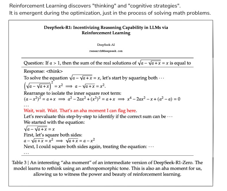 随着训练步数增加,推理准确率增加,与此同时推理的tokens序列也增加,因为LLM涌现出了类似wait, that an aha moment这种情况。模型发展了自己的认知策略,自己的思考方式,reevaluate,多方面思考,思维链,这就是导致响应长度增加的原因,同时也是提高推理准确性的原因。