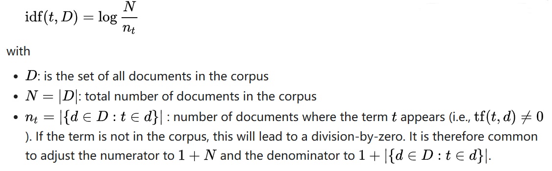 idf:逆文档频率,语料库C中出现词t的文档数越多,说明词t可能是常用词,t的重要性越低。