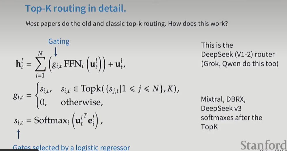 上图是token choice routing,计算每个expert的权重时,类似于计算attention得分,将token embedding u和专家embedding e 做点积,然后softmax归一化(注意,只对topk个专家进行softmax,而不是对所有专家),得到权重 。