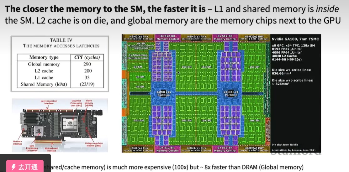 memory越靠近SM,传输速度越快,L1和shared memory在SM内部,而L2 cache在SM旁边 ,即上图中的蓝色区域。而Global memory在GPU的旁边 ,上图中实物图GPU的左右两列小方块就是VRAM,vedio memory,也就是显存 。显存和GPU的传输通过HBM,即上图中的最上面的黄色小方块。计算速度的进步要快于显存传输速度的进步,显存传输成为GPU运算速度的主要瓶颈。
