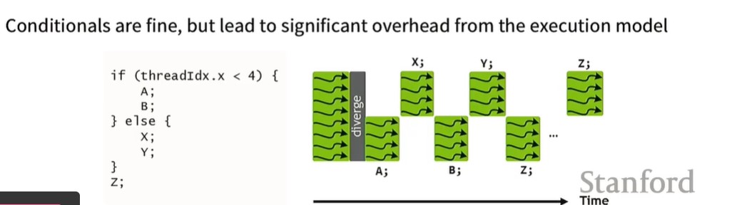 GPU是SIMT架构,Single instruction multiple thread,也就是线程束warp中多个thread执行同一个指令,因此,下图中的指令效率是很低的,