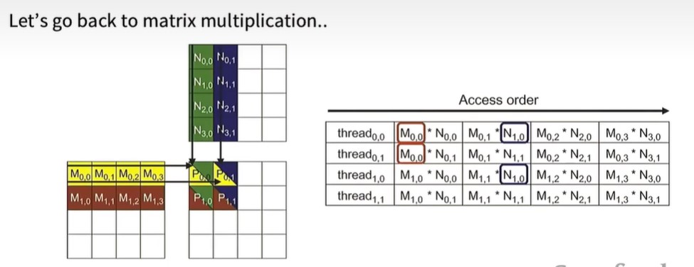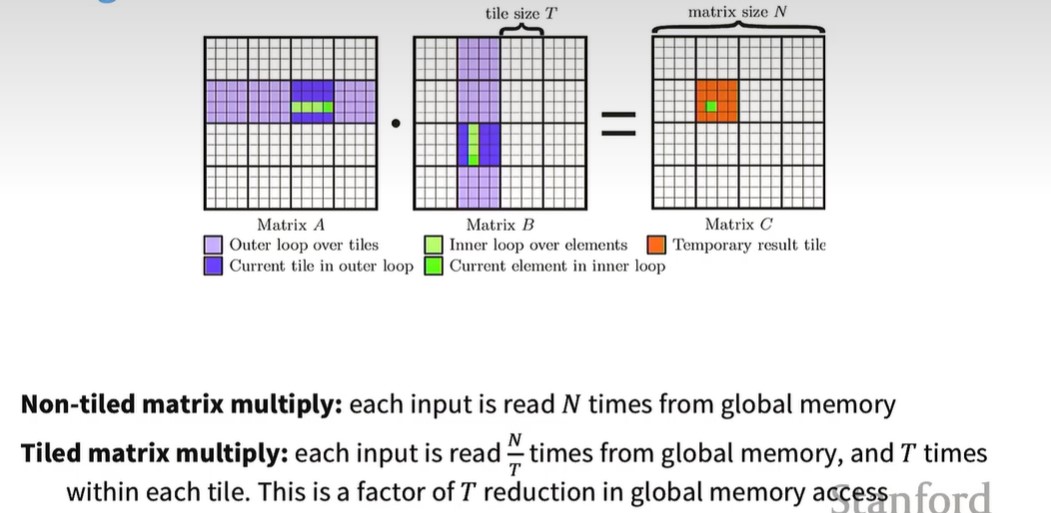 假设两个N*N矩阵相乘,原始做法,每个矩阵中的元素,从global memory中读取N次,而分块后,需要从global memory中读取N/T次,再从shared memory,即tile内部读取T次。