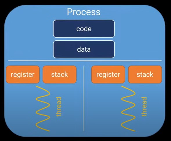 一个进程包含code, data, register,stack等部分,进程之间是独立的,不共享这些参数,一个进程可能包含多个线程,线程之间是共享codedata的,但不共享register,stack