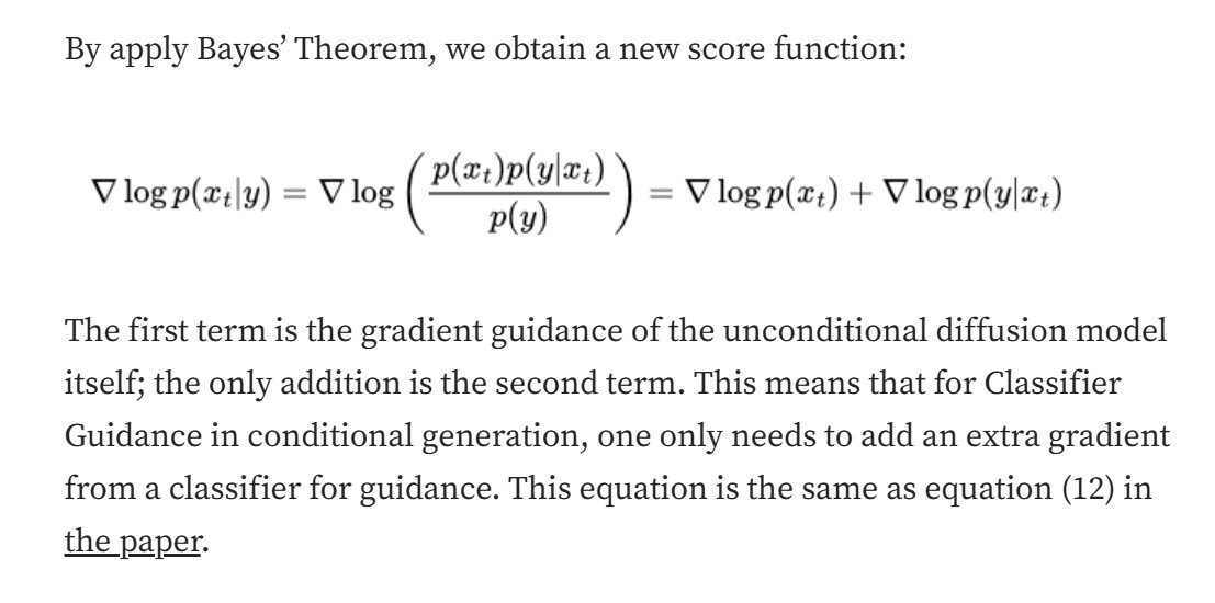 Classifier Guidance 的核心是:通过一个额外训练的分类器,将 “类别信息” 注入扩散模型的去噪过程。具体来说,它利用贝叶斯公式将 “有条件 score”(给定类别y时的去噪梯度)分解为 “无条件 score”(无类别约束的去噪梯度)和 “分类器梯度”(类别对噪声样本的判别梯度)的组合,从而在推理时实现类别引导。