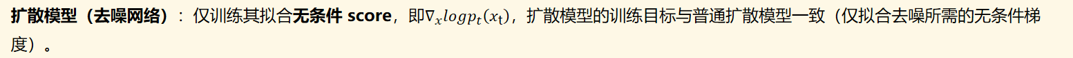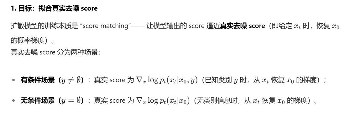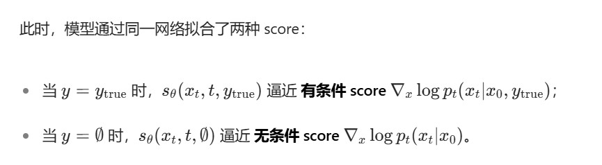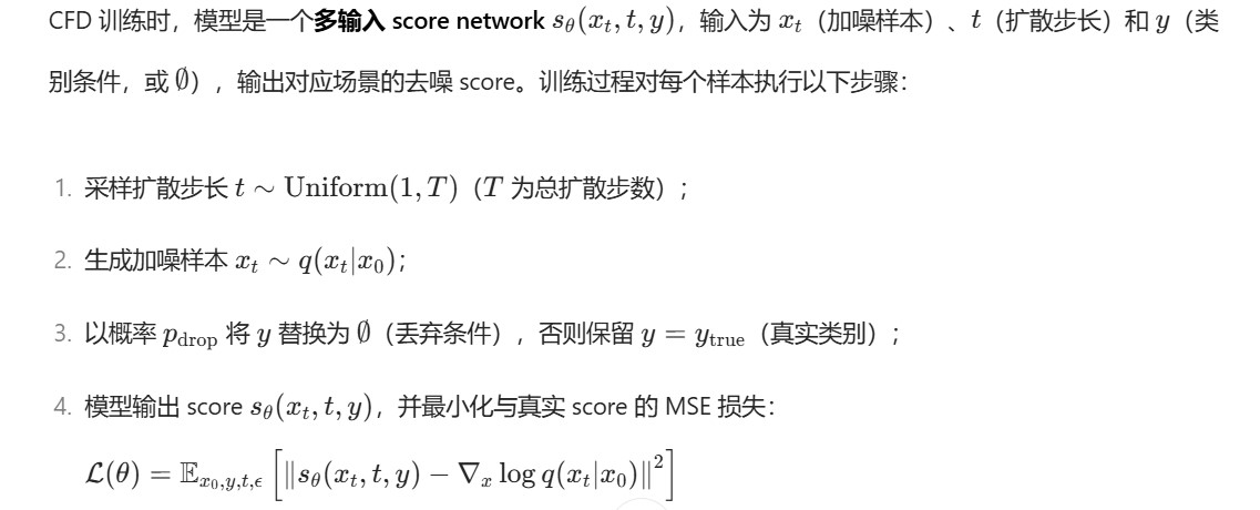 CFD 训练的核心是:让模型在同一网络中,通过 “随机切换条件输入(y 或 空)”,同时拟合有条件去噪 score和无条件去噪 score。