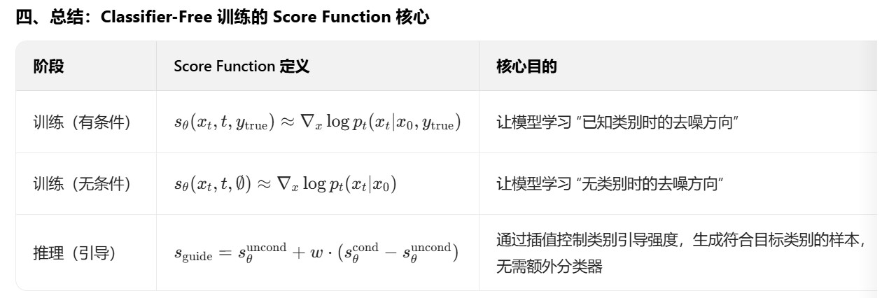 但是,不论是有条件场景还是无条件场景,神经网络需要拟合的都是第t步时的score function(或者说是第t步时的噪声),二者的拟合目标是一致的,