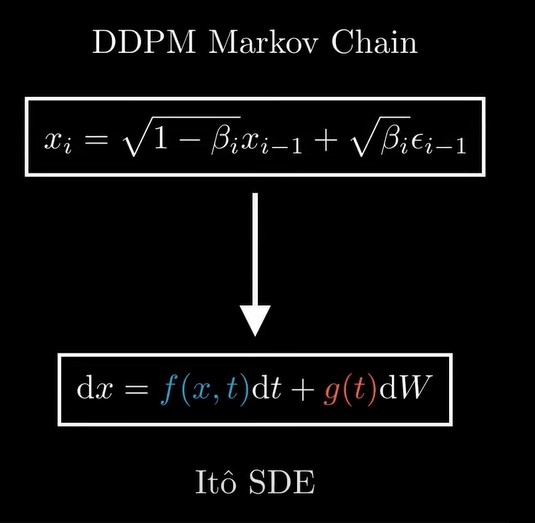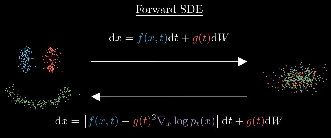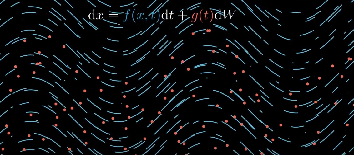 随机可微方程SDE:dx=f(x,t)dt + g(t)dW,其中f(x,t)是确定的,被称为drift,即漂流的大方向。而dW是不确定的,随机的抖动,g(t)表示抖动的强度,被称为diffusion coefficients。