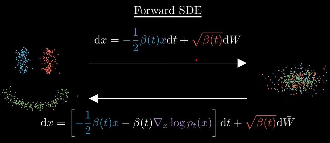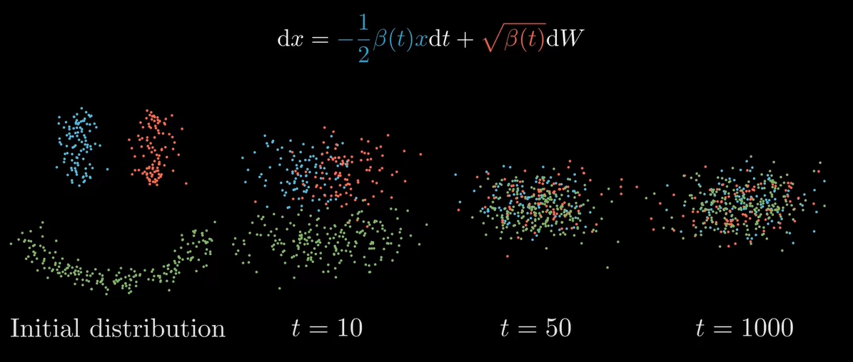 这个式子的物理意义是,第一项drift term 的作用是 pulls datapoints to the origin,第二项diffusion term的作用是spreads them out, preventing datapoints from collapsing to a single point.这和我们DDPM中的前向过程是一样的:将任意图片变成完全噪声图片(将任一原始分布变成高斯分布)。