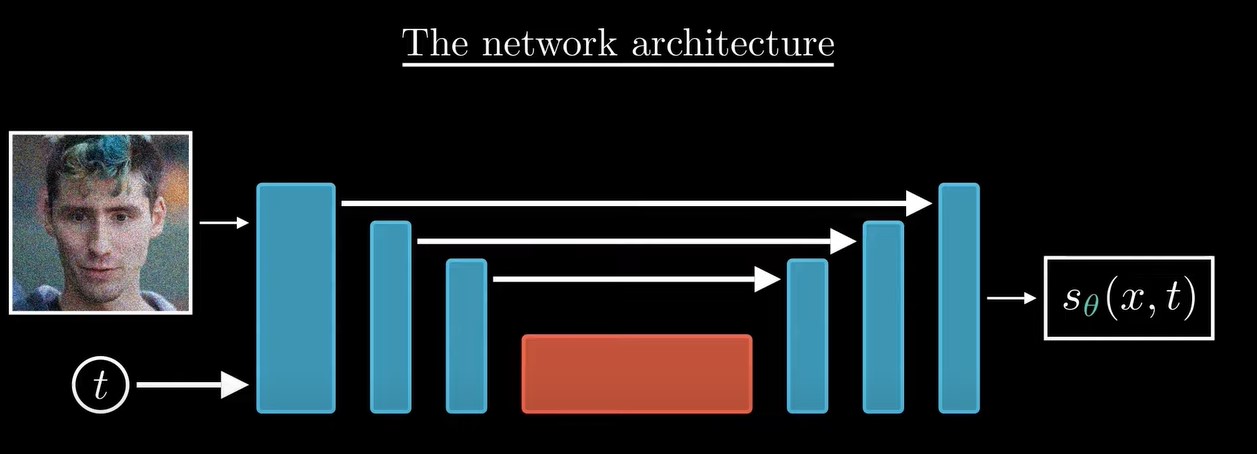 我们需要得到每一步的score function才能reverse SDE,我们用神经网络来学习。神经网络通常是Unet,输入是xt,和t,输出是此时的score funtion。