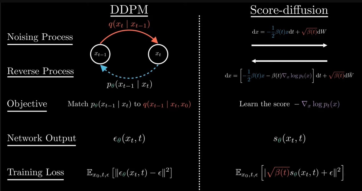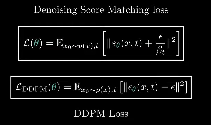 从上图中看出,DDPM和score match 这两种方法的loss是不同的,因为DDPM是预测每一步的噪声,score match预测的是每一步的score Function。但是这两种方法都可以用来生成新的样本。
