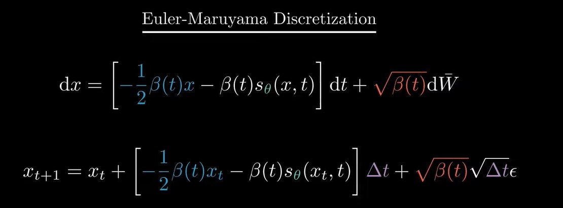 最后,有了score function之后 ,也就有了reverse SDE方程,但是reverse SDE方程是连续的形式,我们需要对其进行离散化来生成新图片,离散化有很多方法,是一个被广泛研究的领域,最常用的是Euler-Maruyama离散化,