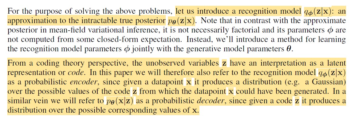 我们用来近似真实后验,也被称为probabilistic encoder,因为给定一个x,输出的是关于z的概率分布。也被称为probabilistic decoder,因为给定一个z,输出的是关于x的概率分布。![]()