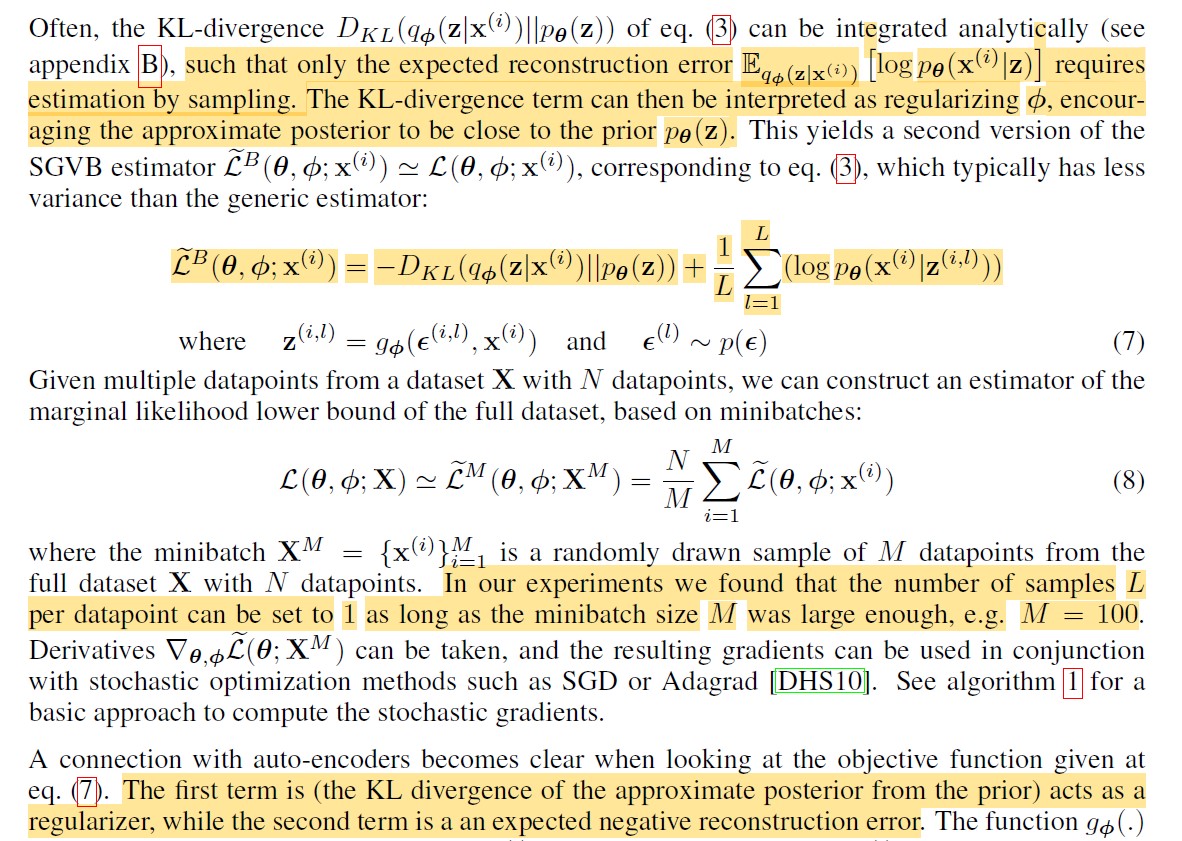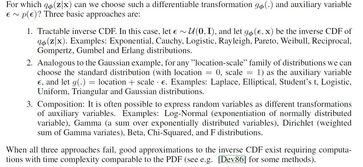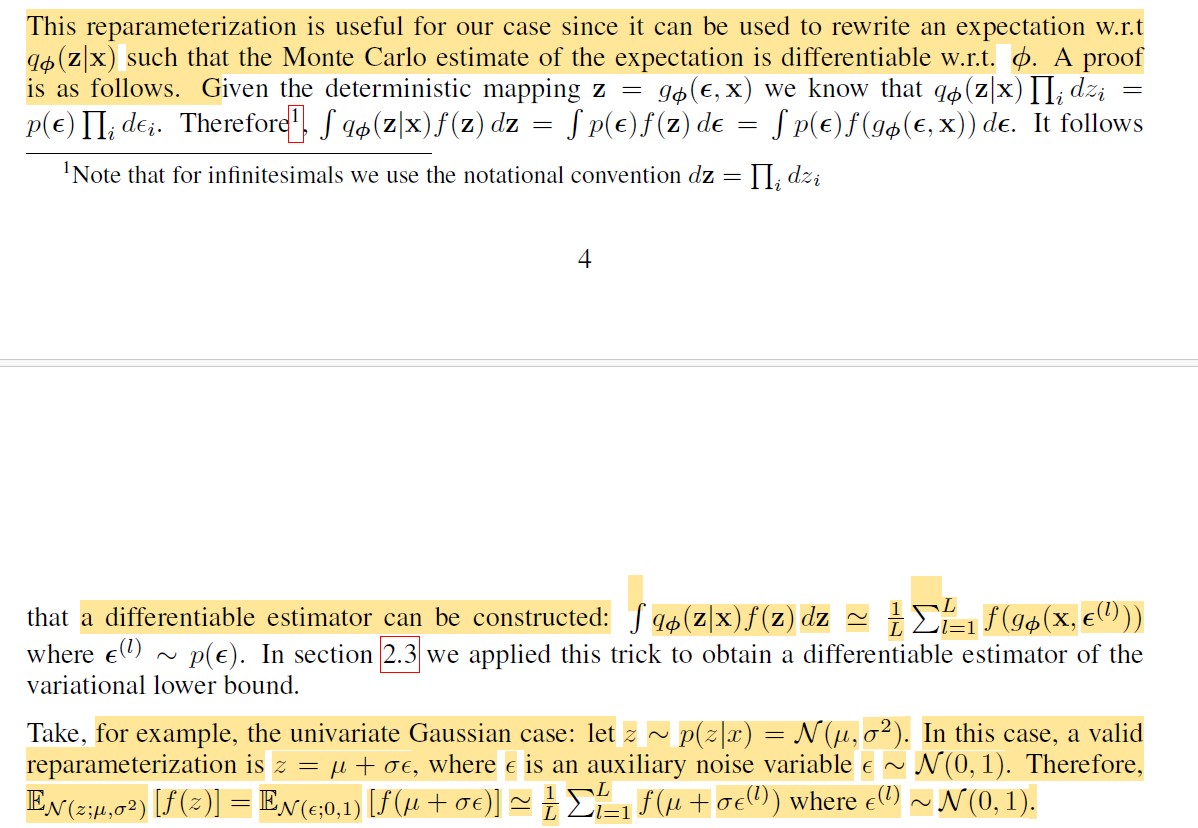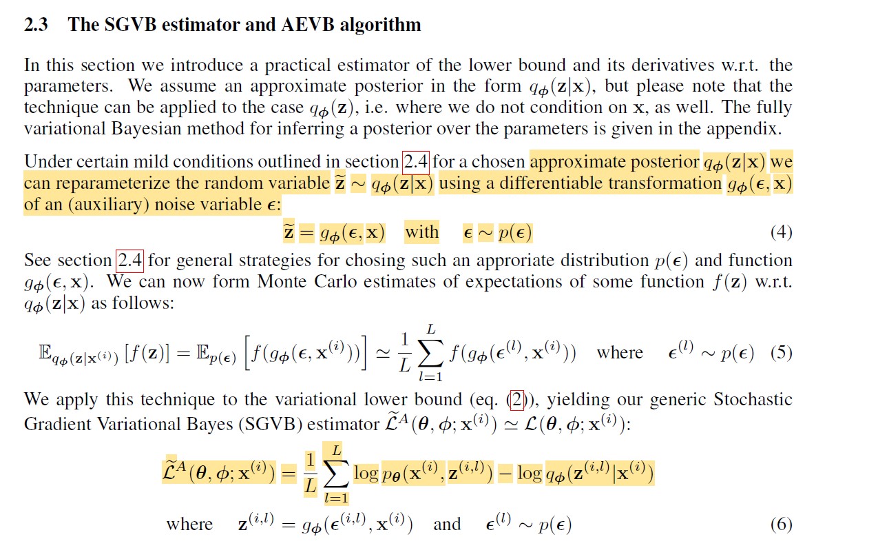我们可以用重参数化技巧:公式(4),将原来的变成,也就说,原来的z是从这个分布中采样得到的,重参数化之后,z是由函数得到的。经过公式(4)重写之后,公式(2)的估计值可以写成公式(6)的形式,这个估计值的方差就变小了?,关键是使L对参数变得可导了。![]()