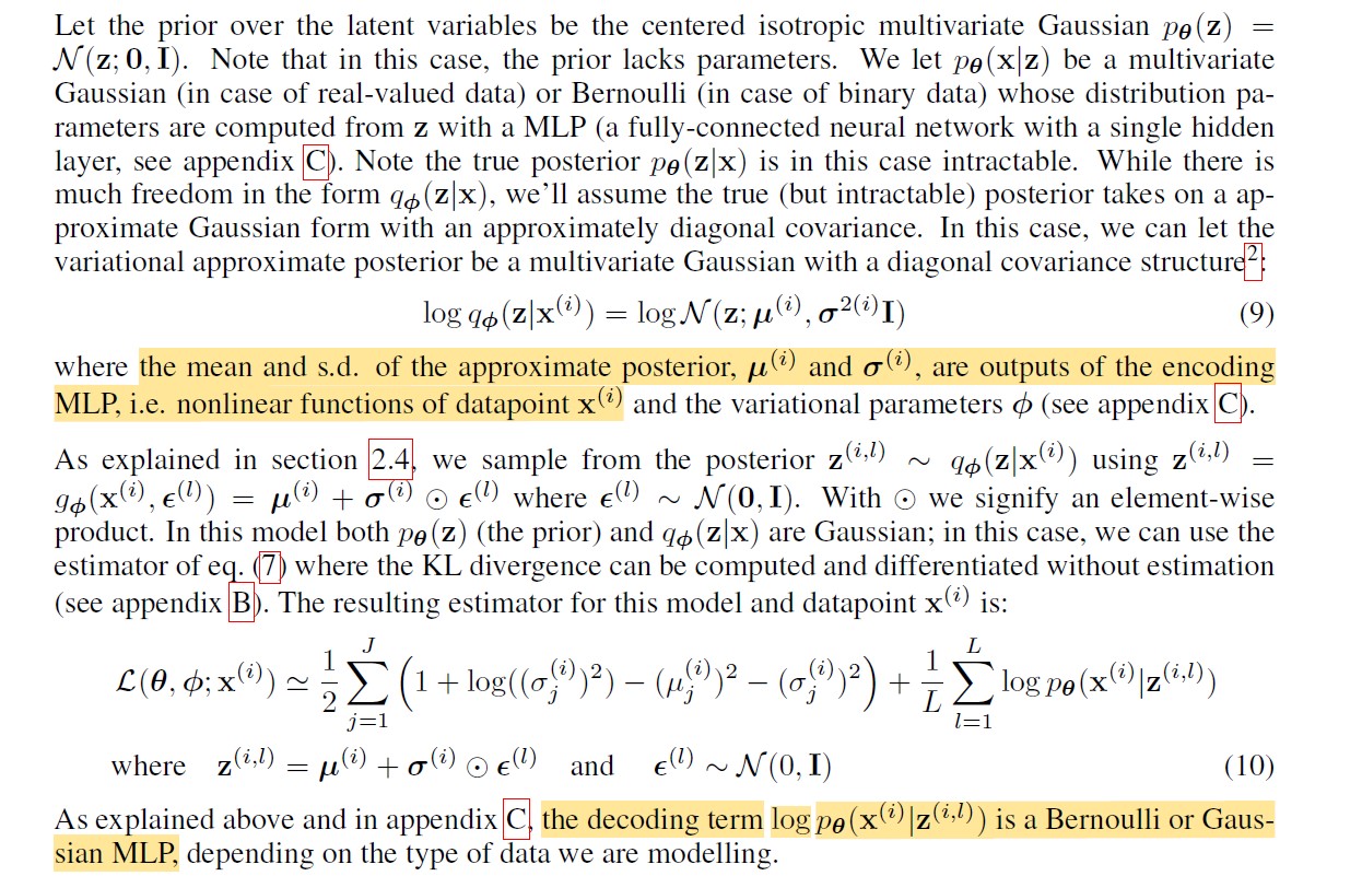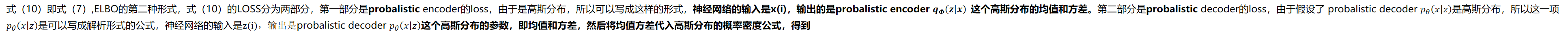 式(10)即式(7),ELBO的第二种形式,式(10)的LOSS分为两部分,第一部分是probalistic encoder的loss,由于是高斯分布,所以可以写成这样的形式,神经网络的输入是x(i),输出的是probalistic encoder 这个高斯分布的均值和方差。第二部分是probalistic decoder的loss,由于假设了 probalistic decoder 是高斯分布,所以这一项 是可以写成解析形式的公式,神经网络的输入是z(i),输出是probalistic decoder 这个高斯分布的参数,即均值和方差,然后将均值方差代入高斯分布的概率密度公式,得到