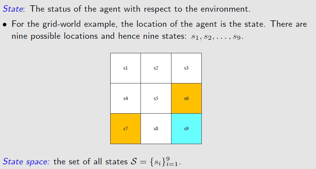 Agent处于环境中的状态,对于网格环境来说,状态就是所在风格的位置location。