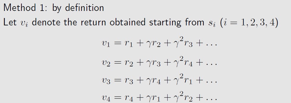 这就是bellman方程的形式。Though simple, it demonstrates the core idea: the value of one state relies on the values of other states.