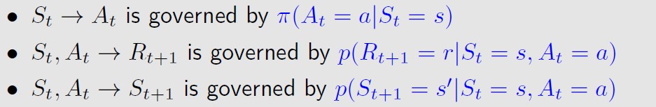 St ==> At,是由概率分布policy π决定的,St,At==>Rt+1,是由reward函数决定的;St,At==>St+1,是由