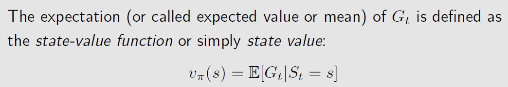 It is a function of s. 不同的状态,有不同的状态值函数。It is a conditional expectation with the condition that the state starts from s.
