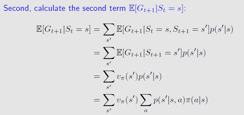 首先来看第一项,E[Rt+1|St=s]表示 当前t时刻的状态为s的条件下,下一个时刻,即t+1时刻的reward的期望,