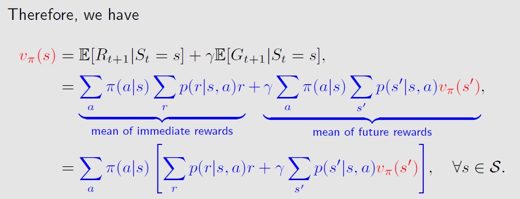 这就是bellman方程,它的含义是,状态s的state value可以由下一步的immediate reward的期望(平均值)