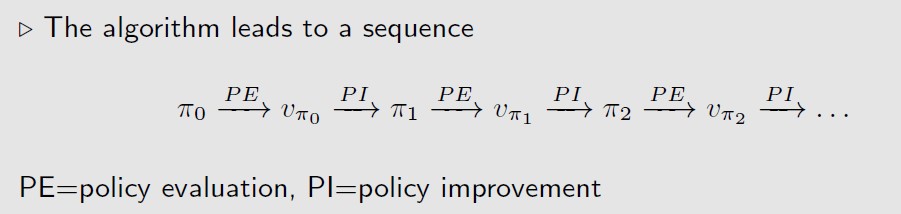 初始化π0,然后进行policy evaluation得到v,再进得policy improvment得到π1….迭代下去