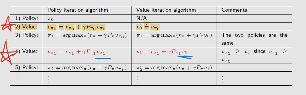 1)在上图步骤2中,在初始化第一个v时,值迭代是直接用一个值初始化v0,策略迭代是先初始一个策略π0,然后通过迭代求解bellman公式得到v_π0