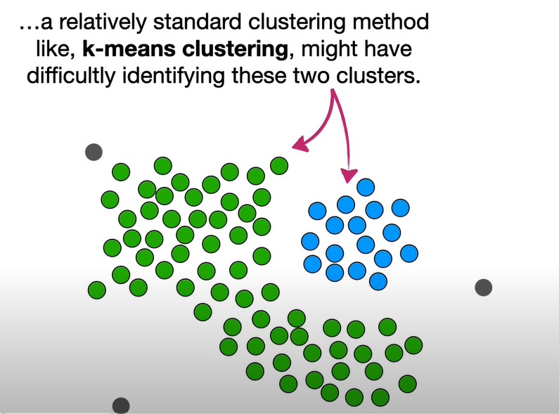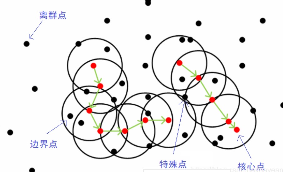 DBSCAN(Density-Based Spatial Clustering of Applications with Noise,具有噪声的基于密度的聚类方法)是一种基于密度的空间聚类算法。该算法将具有足够密度的区域划分为簇,并在具有噪声的空间数据库中发现任意形状的簇,它将簇定义为密度相连的点的最大集合。关于什么是密度相连我们下面解释。