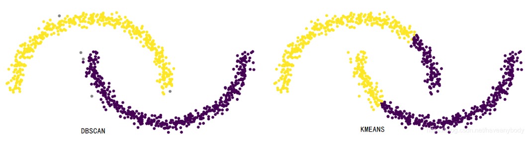 人类用肉眼能轻松看出上图中两个类别 ,是根据密度来看的,dbscan就是根据密度来聚类 的。