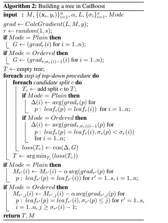 上图是catboost如何构建每一棵树的算法,在每轮构建新树之前,先选择一种样本排序方式σr,然后用当前的支持模型M和真实标签y,计算出每个样本的梯度/残差,即上图中的G和下图中的Residuals,然后开始构建新树。