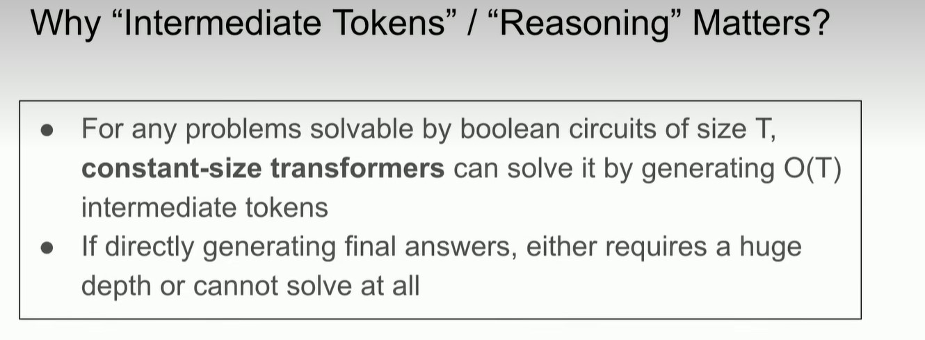 真正的答案是:对于一个size为T的布尔电路可以解决的问题,constant-size transformers需要O(T)个token来解决(斯坦福的一项研究,从理论的角度来解释推理)。(深度不够,长度来凑)