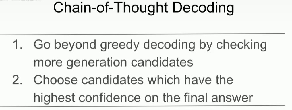 因此,我们可以不用greedy decoding,而是用chain-of-thought decoding,也就是选择答案token置信度最高的response,而不是选择下一个token概率最高的。