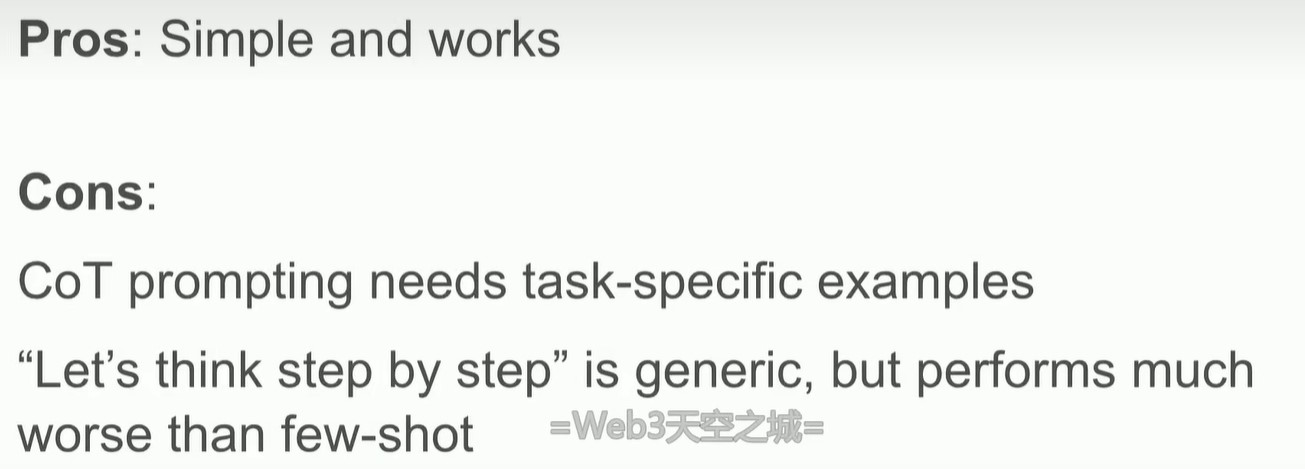 但是通过改变prompt(llm是一个函数f(x),改变f(x)中的x)这种方式,虽然简单,但是需要我们设计合适的task-specific examples,并不通用(只加入lets think step by step效果一般),