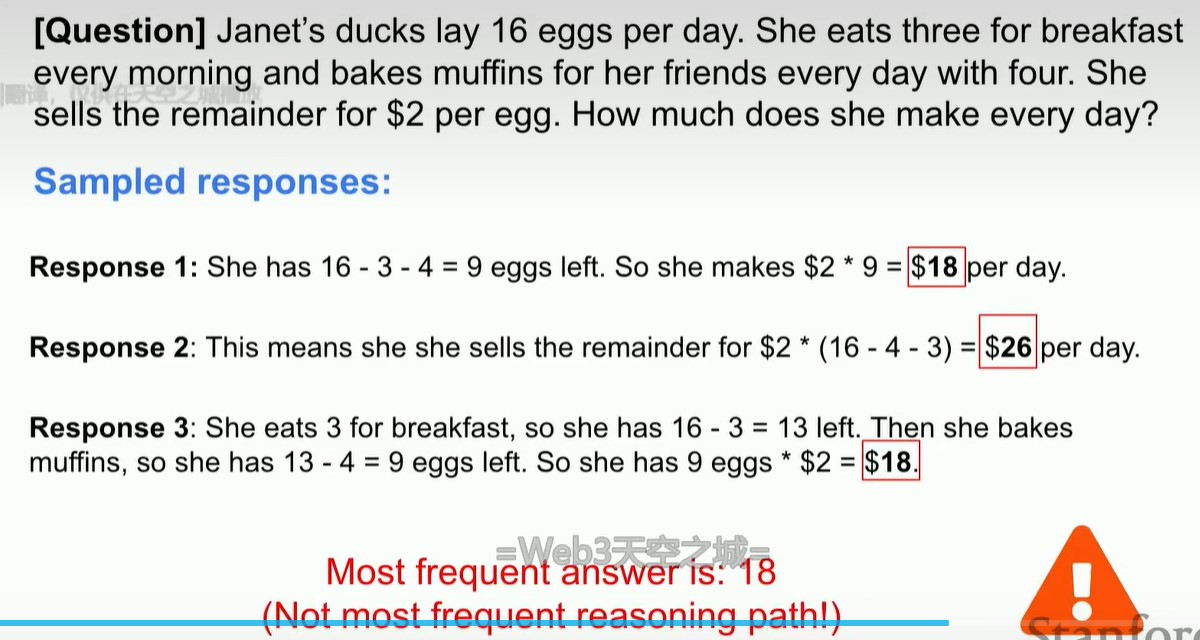 从上图看出,如果是greedy decoding,那么没有reasoning的过程,而如果不用greedy decoding,进行多次采样 ,那么会生成具有reasoing的response,并且答案是正确的。而且在这些具有reasoing的response中,答案token的置信度是很高的,高于greedy decoding的答案token的置信度。(什么是greedy decoding, 即argmax(answer|problem)))