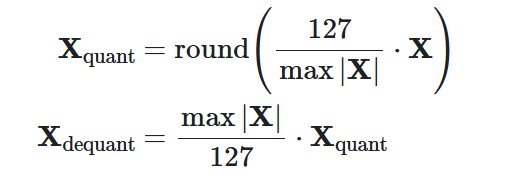 • With absmax quantization, the original number is divided by the absolute maximum value of the tensor and multiplied by a scaling factor (127) to map inputs into the range [-127, 127]. To retrieve the original FP16 values, the INT8 number is divided by the quantization factor, acknowledging some loss of precision due to rounding.