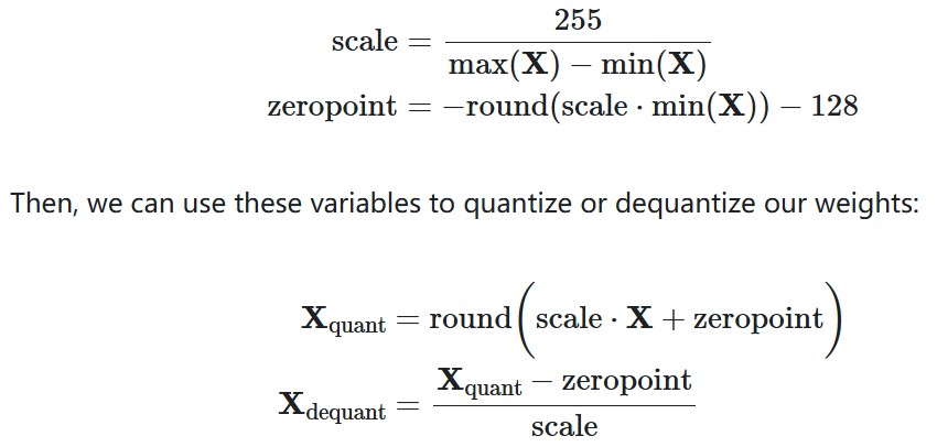 In this section, we will implement two quantization techniques: a symmetric one with absolute maximum (absmax) quantization and an asymmetric one with zero-point quantization. In both cases, the goal is to map an FP32 tensor (original weights) to an INT8 tensor  (quantized weights).