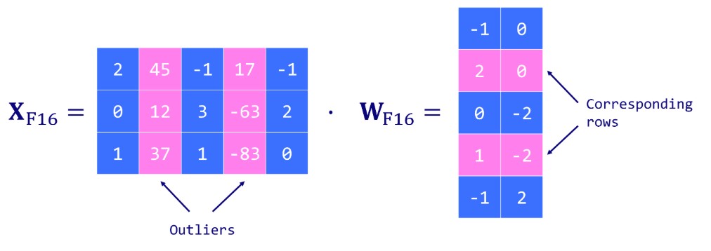 • Perform the matrix multiplication of the outliers using FP16 and the non-outliers using INT8 with vector-wise quantization (row-wise for the hidden state and column-wise for the weight matrix ).