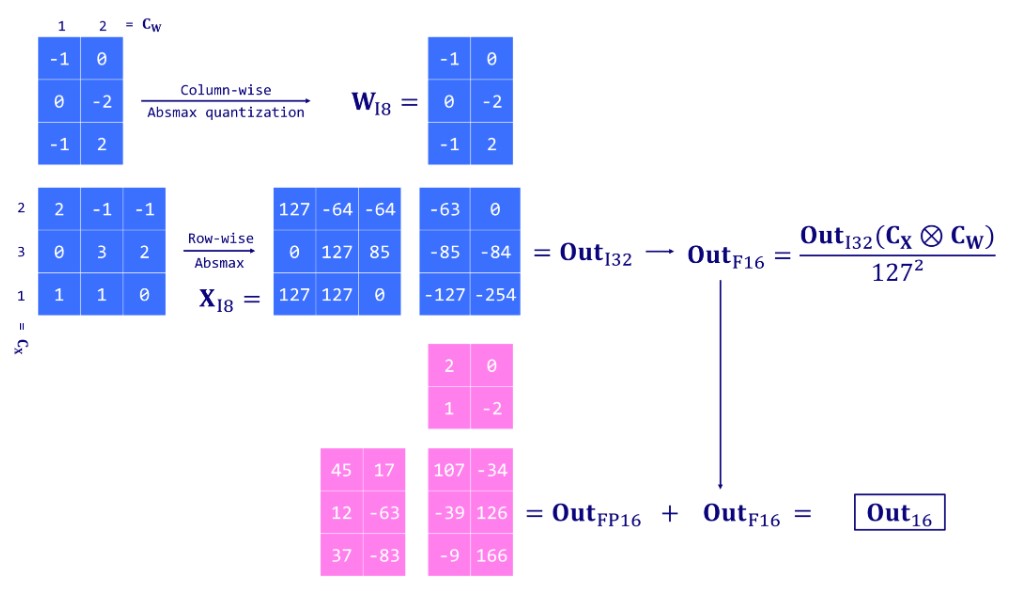 • Dequantize the non-outlier results (INT8 to FP16) and add them to the outlier results to get the full result in FP16.