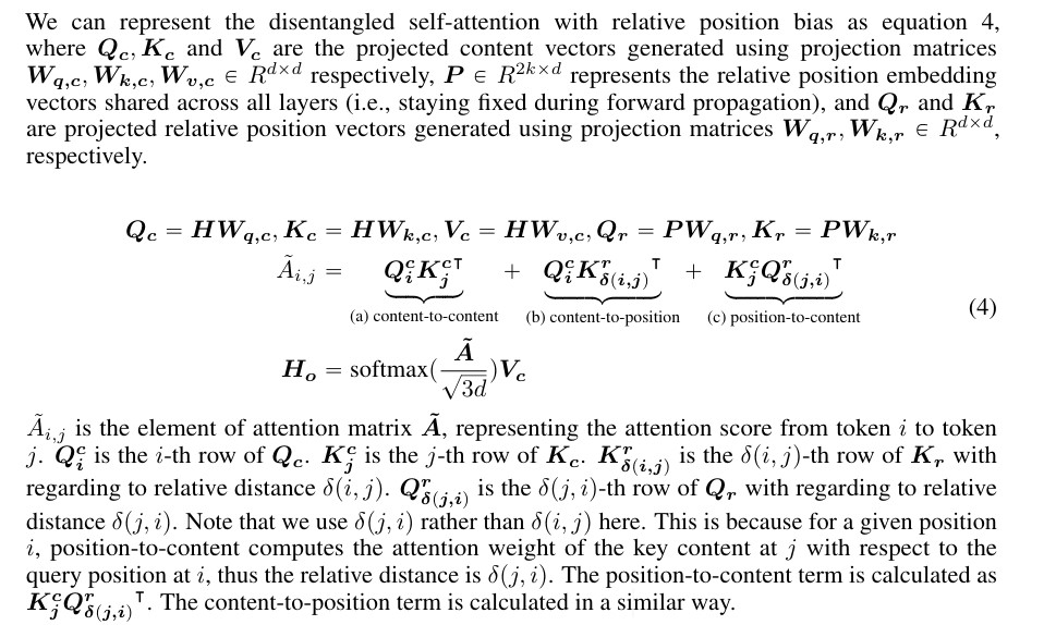 上图中说到,P表示相对位置的position embedding,并且对于所有层是共享的,也就是说和绝对位置编码的做法不同,deberta中每一层都需要注入相对位置信息,而标准的bert中只需要在初始输入时将content embedding和position embedding相加作为输入即可,后续层不需要显式注入位置信息。