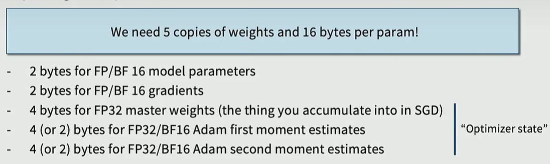 Naïve data palrallel的问题在于memory 占用,每个GPU上除了存储模型参数,还需要存储gradients, master weights, 一阶估计,二阶估计,关键是这些参数在所有的GPU上都是重复的,总的内存占用是随着GPU数量增加线性增加的。