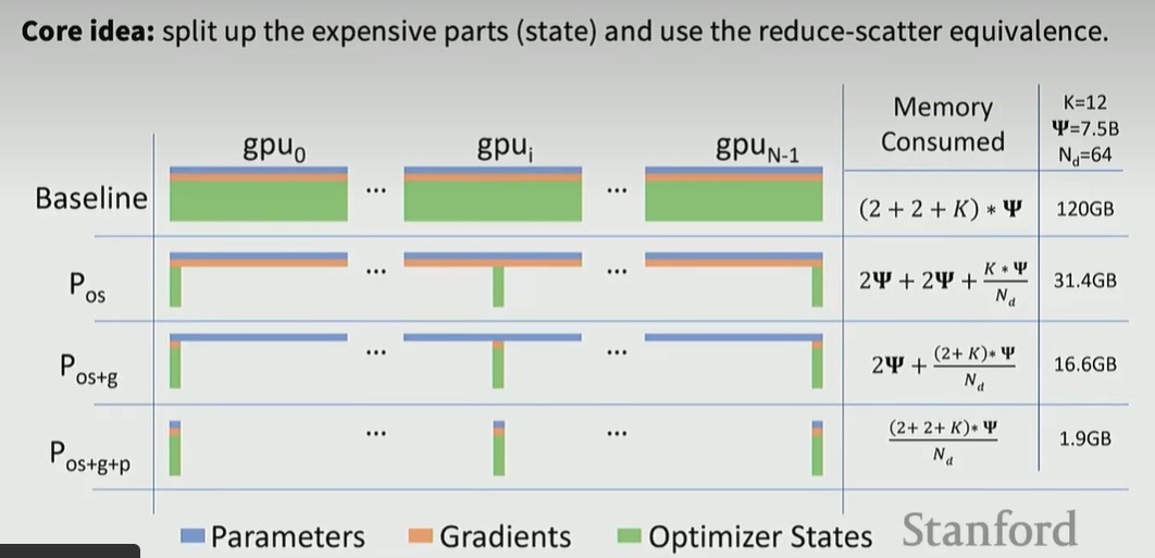 上图第二行,Pos, 通过optimizer sharding,可以降低总内存占用至31GB