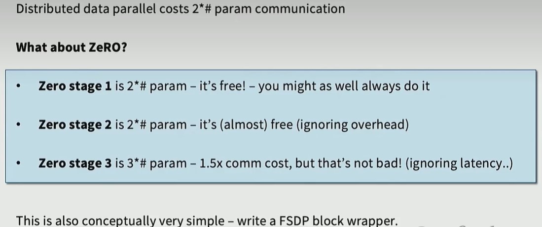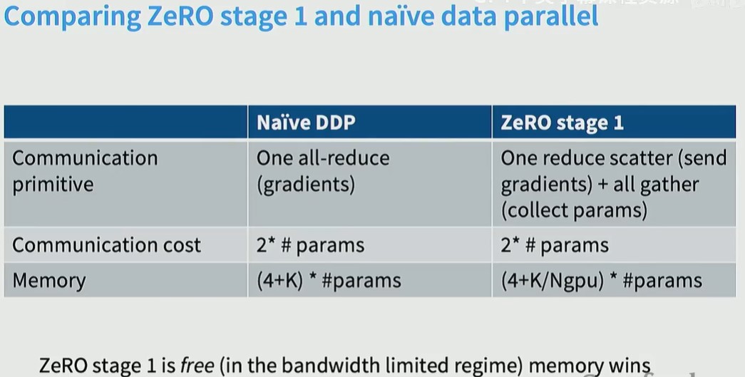 ZERO stage1的通信成本(一次reduce scatter 和一次all gather)和Naïve DDP(一次all reduce)是一样的,但是memory节省了很多。