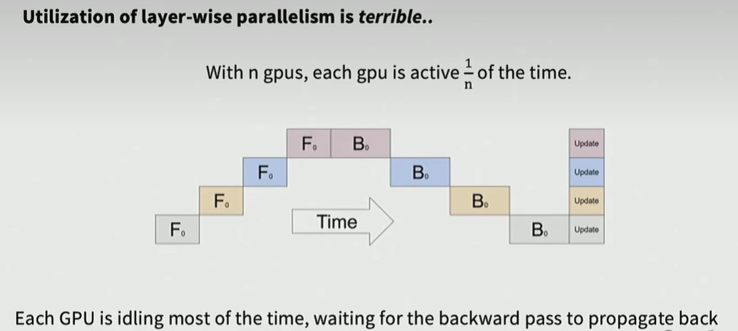 Layer-wise 并行的缺点是,GPU利用率低,必须等其他GPU计算完成后,当前GPU才能开始计算,