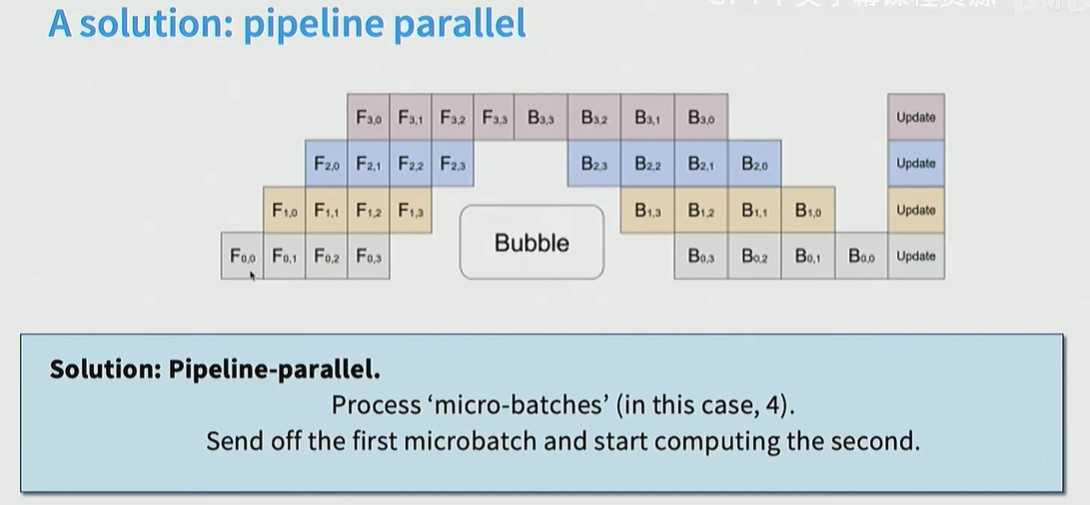 解决方案是一次处理一个bacth,而不是一个样本,GPU0处理完当前样本后,马上开始处理下一个样本,这样,中间bubble的空闲时间变少了。